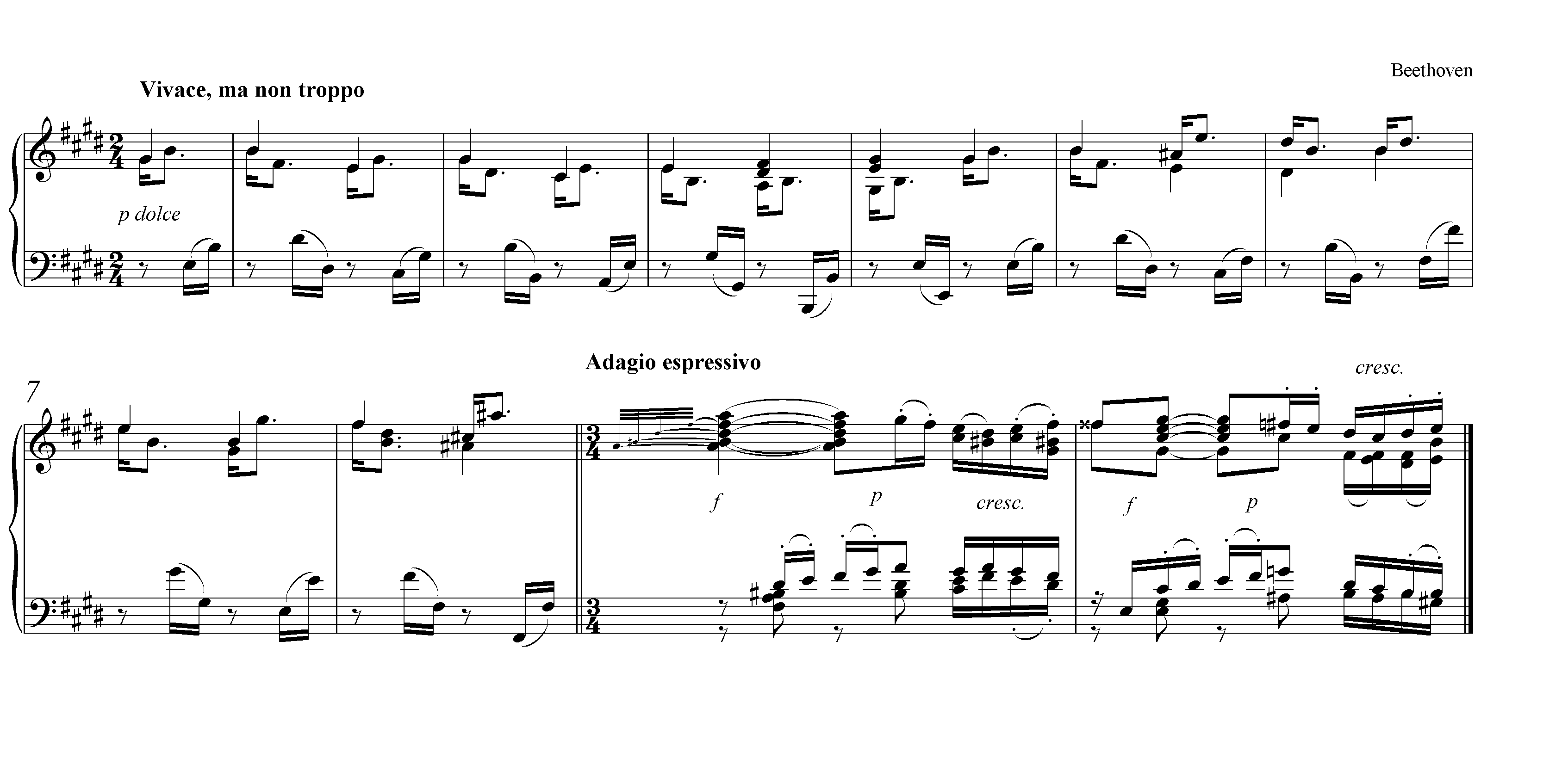 Pictured in the graphic below is the first 10 measures of Beethoven’s Piano Sonata no. 30 opus 109 in E major. The first movement of this sonata is in my top two favorite Beethoven piano sonata movements of all time, along with the finale of his Sonata 32. It’s one of the pieces I chose to play for my father the day before he died in a hospice ward; throughout his entire life, my father had a deep appreciation for Beethoven’s piano sonatas and contributed to my love of music.