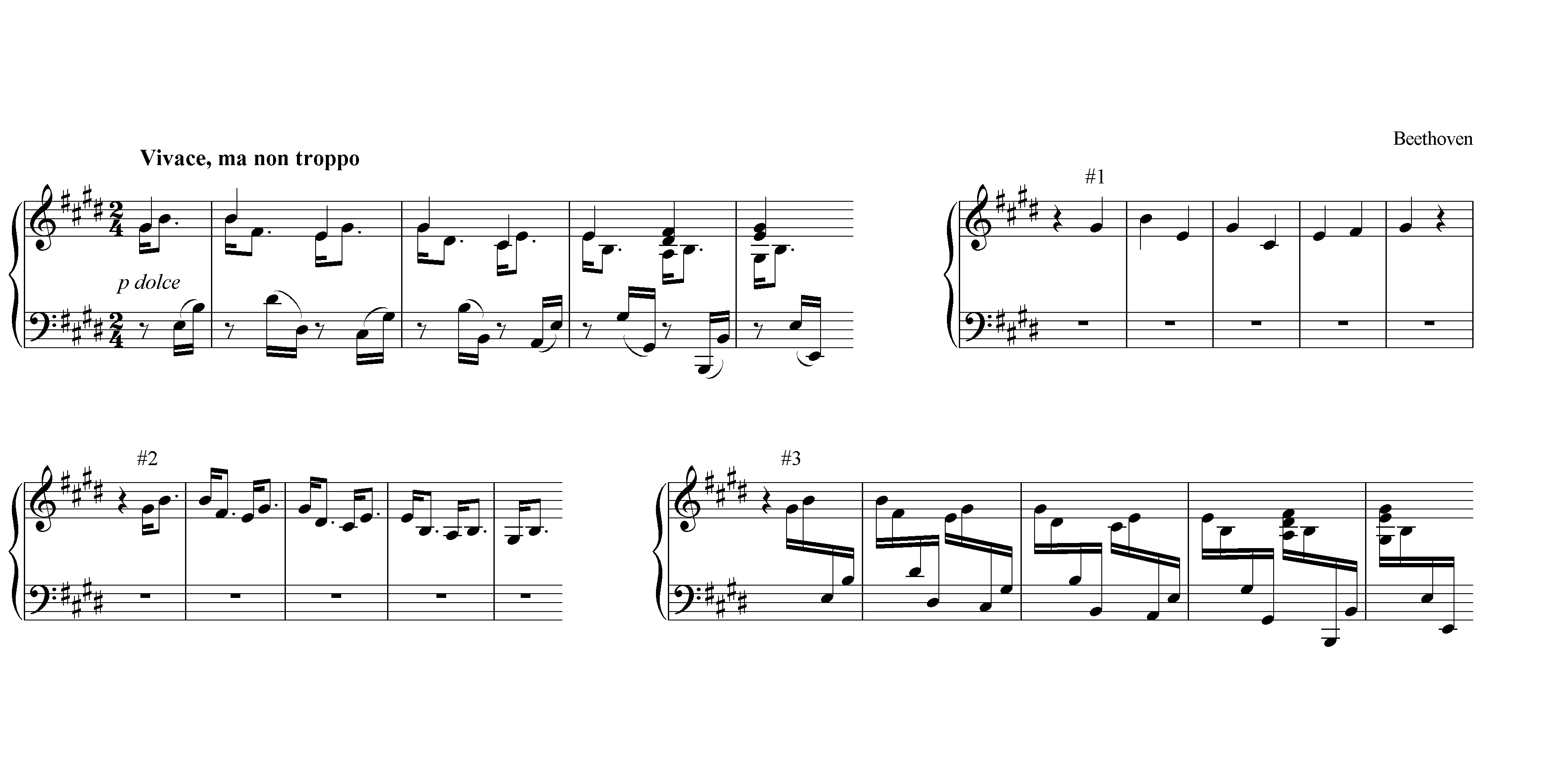 At the beginning of the first line you can see the original music Beethoven wrote for the opening phrase of the sonata. The melody, played by my right hand in the top staff, is composed of little two-note groups which alternate going up and down in a pattern that gradually moves down the piano. Underneath the right hand’s melody, the left hand has some accompanying music which also contains two-note groups, also meanders gradually downward on the piano, but has slightly wider leaps between the two notes of each individual pair. Sounds pretty simple: melody and accompaniment. However, Beethoven does a few subtle things that produce music that can be heard three different ways, which I’ve illustrated as #1, #2, and #3.